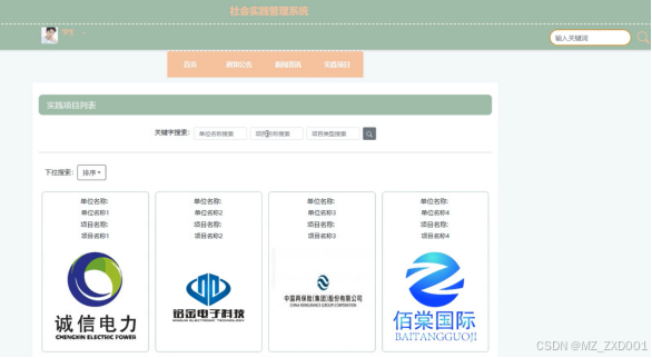 通过单位用户功能页面,单位用户可以查看首页、通知公告、新闻资讯、实践项目、我的账户、个人中心(实践项目、参加实践、实践打卡、实践评价)等,并且可以根据需要进行相应的操作,界面如下图所示。