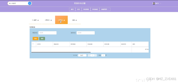 在点击导航栏上的“订单配送”后,会显示自己提交的所有的订单配送,可以按照订单配送状态等进行查看,订单配送管理界面如下图6-8所示。