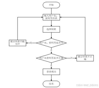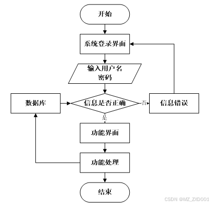 用户打开并进入系统后,会先显示登录界面,输入正确的用户名和密码,系统自动检测信息,若信息无误,则用户会进入系统功能界面,进行操作,否则会提示错误无法登录,操作流程如图2-5所示。