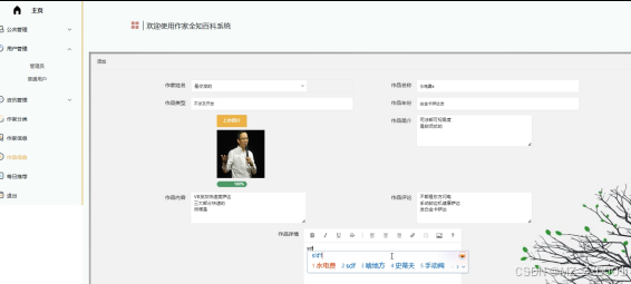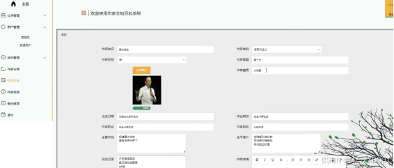 管理作家的详细信息,包括个人简介、作品风格等,以及作家所属分类。管理员可以上传作家的详细信息。界面如下图所示。
