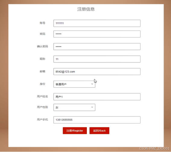 注册模块满足用户两部分,当用户想要进行资料相关信息的查询管理的时候,就必须进行登录,如果没有账号的话,在登录界面,点击“注册”按钮就会跳转到注册的界面,根据提示填写好注册信息,添加提交,注册的信息在数据库中就添加完成了,然后再输入填写好的账号和密码进行登录。注册界面如下图所示: