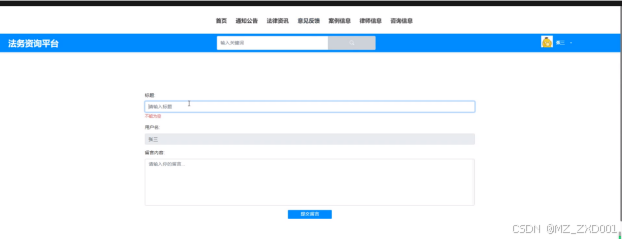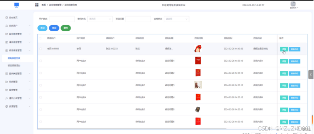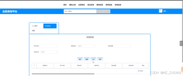- 咨询信息管理:管理员可以查看普通用户提交的咨询信息详情并进行审核和回复;可以查看律师用户对普通用户提交的咨询信息的回复并进行审核;可以对咨询信息进行增删改查操作。