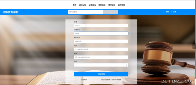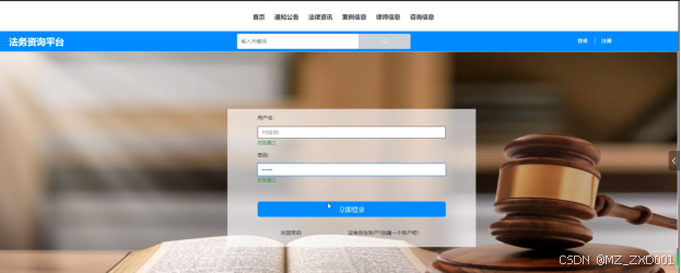 - 注册登录:律师可以通过注册成为系统用户,注册后需由管理员进行审核,审核通过后方可使用账号密码登录。