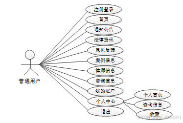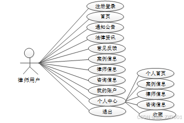 - 我的:用户点击我的头像的下拉按钮“我的账户”进入页面可以修改个人信息和登录密码;点击“个人中心”进入页面可以查看和管理个人首页、案例信息、律师信息、咨询信息和收藏信息;点击“退出”即可退出系统的登录。