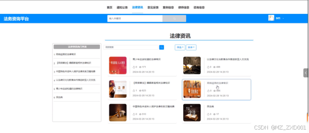 - 法律资讯:用户可以查看法律资讯列表中某个资讯的详情并可以点赞、收藏和评论。