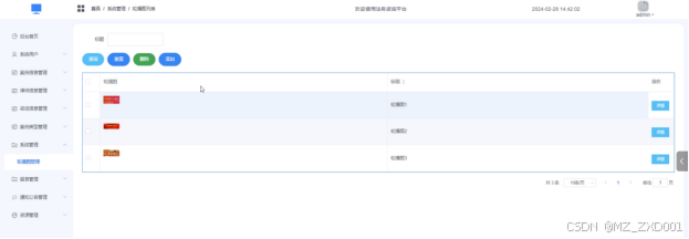 - 系统管理:管理人员在“系统管理”这一菜单下对轮播图进行管控,可以对轮播图信息进行增删改查操作。
