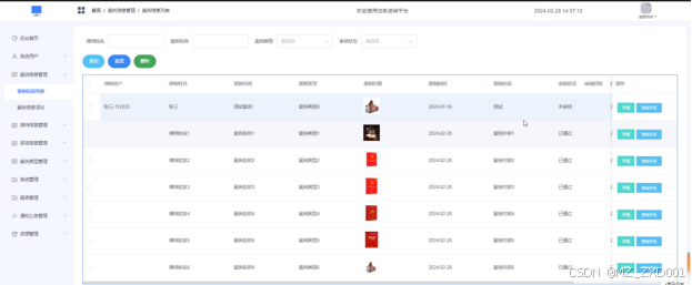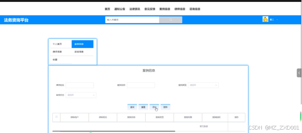 - 案例信息管理:可以查看律师用户提交的案例信息详情并进行审核和回复;可以查看案例信息列表中某个案例的详情和评论,可以对案例信息进行增删改查操作。