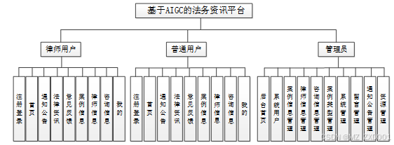 按照 基于AIGC的法务资讯平台的角色,主要包括律师用户、普通用户和管理员这三大功能模块,各模块功能如下。