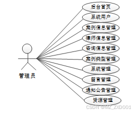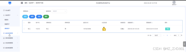 - 系统用户:管理员负责对新注册的律师用户信息进行审核;管理员可以对系统用户信息进行增删改查操作。