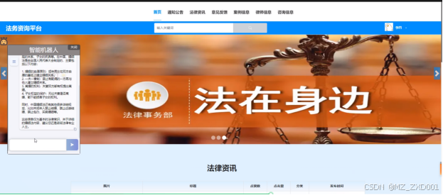 - 首页:首页界面是用户访问系统的入口页面,用户可以查看首页展示的轮播图、法律资讯等信息。同时提供智能机器人问答功能,点击首页左上角的智能机器人进入会话框输入想要咨询了解的信息,智能机器人会自动回复用户信息。