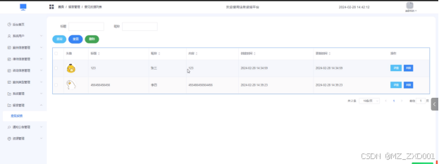 - 留言管理:管理员可以查看留言反馈列表中某个用户的留言反馈详情并可以回复,可以对留言反馈信息进行查询、重置和删除操作。