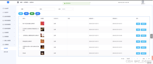 - 资源管理:在资源管理菜单,管理员对法律资讯和资讯分类进行管控。管理员可以对法律资讯、资讯分类信息进行增删改查操作。