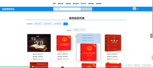 This system is developed using the Spring Boot+VUE framework. Spring Boot is a mature and stable framework widely used in the development of enterprise level applications. It provides a range of built-in features and tools that can greatly simplify the development process of web applications. Vue is a lightweight modern front-end framework used to build user interfaces. Vue's component-based development model makes the code more modular and easy to maintain. The research on this system aims to provide users with more intelligent and efficient legal information services.