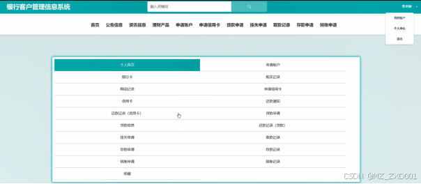 个人中心:用户点击头像可查看“个人中心”,包括个人首页、申请账户、银行卡、购买记录、赎回记录、申请信用卡、信用卡、还款通知、还款记录(信用卡)、贷款申请、贷款信息、 还款记录(贷款)、挂失申请、取款记录、存款申请、存款记录、转账申请、转账记录和收藏。界面如下图所示。