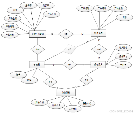 在数据库概念模型设计的时候,一般都采用E-R实体图进行展示,在实体图中可以展示出数据库表中的所有字段名称,下面是整个银行客户管理信息系统总E-R实体关系图。