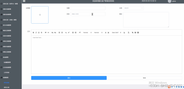 资源管理:管理员点击可查看咨讯信息和咨讯分类;如需添加新的资讯,点击“新增”按钮,上传封面图,输入标题,选择分类,输入标签、描述和正文,点击“确认”按钮进行添加。同时可对咨讯进行增删改查。界面图如下。