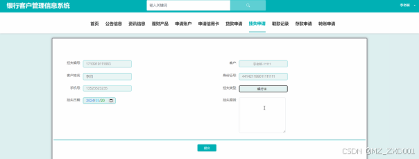 挂失申请:用户点击可填写挂失申请信息,包括选择挂失类型、管事日期和填写挂失原因。界面图如下。