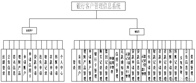 银行客户管理信息系统的开发主要是提高管理效率,所以在系统的功能方面我们首先要从系统管理者的角度进行确保能够满足每个用户的需求,因此在功能上主要规划了管理员功能模块、普通用户功能、主管用户模块三部分。