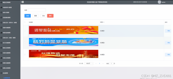 系统管理:当管理员点击“系统管理”时,可查看轮播图; 如需添加新的轮播图,点击右侧“添加”按钮,上传图片,输入标题,点击“确认”按钮进行添加;同时可对轮播图进行增删改查。界面图如下。