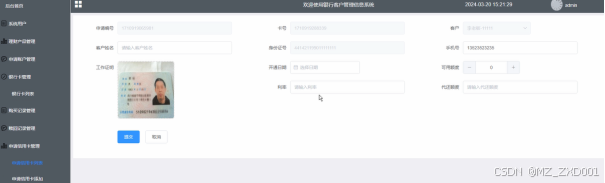 申请信用卡管理:管理员点击可查看申请信用卡列表,同时可点击“同意办理”,并填写相关信息。界面图如下。
