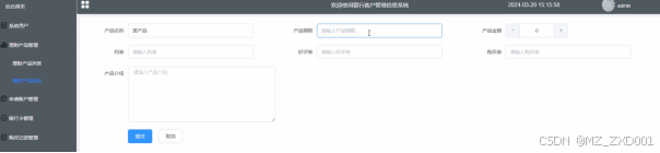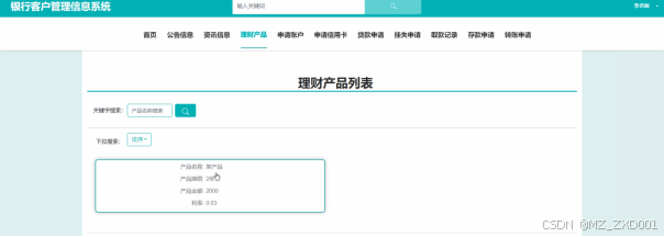 理财产品管理:管理员点击可查看理财产品列表和理财产品添加;点击“理财产品添加”,输入产品名称、产品期限、产品金额、利率、好评率、购买率和产品介绍,点击“提交”按钮进行添加。界面图如下。