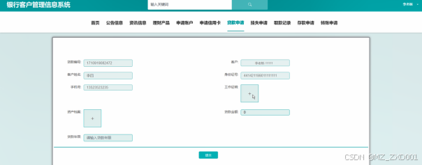 贷款申请:用户点击可填写贷款申请信息,包括上传工作证明、资产档案、贷款金额和贷款年限。展示如下图所示。