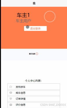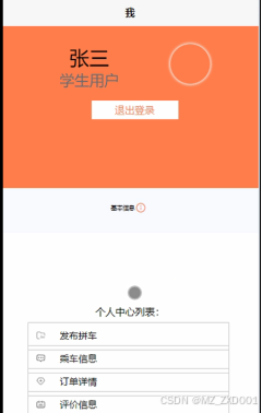 我的:用户点击可对基本信息、发布拼车、乘车信息、订单信息、评价信息等进行管控。界面图如下。