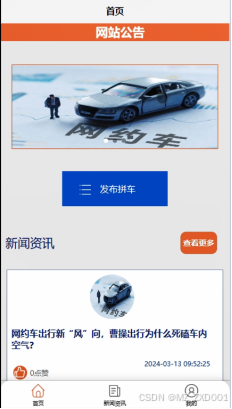 (2)首页:用户可查看轮播图、网站公告、发布拼车、新闻咨讯、和我的等系统功能。