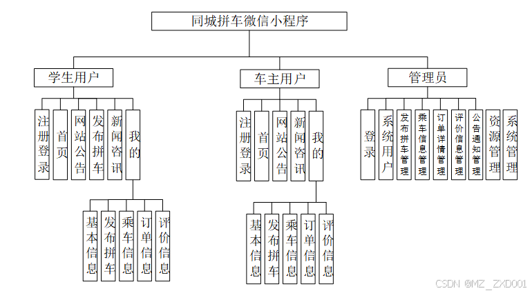 通过对同城拼车微信小程序的需求分析,该系统主要分为学生用户、车主用户和管理员三大功能模块。具体如下: