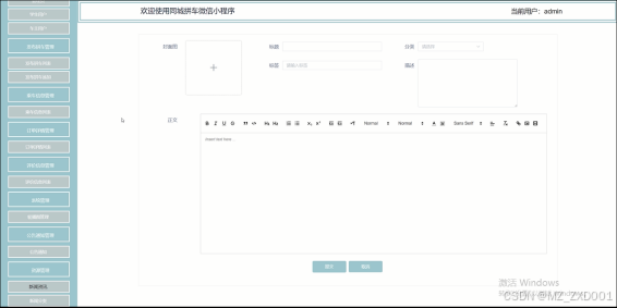 (9)资源管理:管理员点击可查看新闻咨讯和新闻分类;如需添加新的宠新闻咨讯,点击“添加”按钮,上传封面图,输入标题,选择分类,输入标签、描述和正文,点击“提交”按钮进行添加。同时可对咨讯进行增删改查。