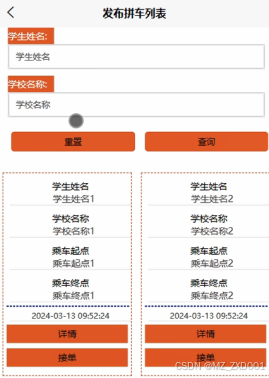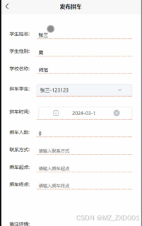发布拼车:用户点击可填写“发布拼车”操作,包括学生姓名、学生性别、学校名称、选择拼车学生、拼车时间,输入乘车人数、联系方式、乘车起点、乘车终点和备注详情。界面图如下。