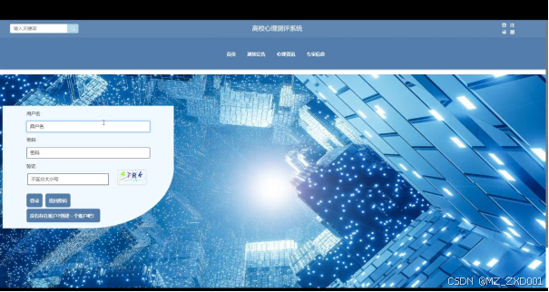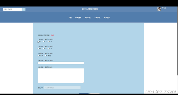 心理测评:参与心理测评活动,填写问卷或进行测试,获取个人心理评估结果。界面如下图所示。