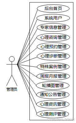 高校心理测评系统中管理员角色功能包含了后台首页、系统用户(管理员、学生用户、心理专家)、专家信息管理、心理咨询管理、心理预约管理、心理诊断管理、特殊案例管理、周报月报管理、轮播图管理、通知公告管理、心理资讯管理、心理测评管理等功能,管理员的用例图如图2.2所示: