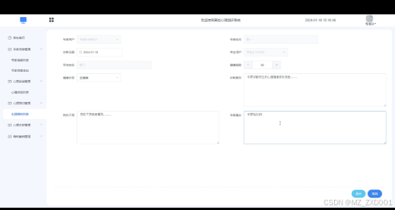 - 心理诊断:接受心理诊断服务,进行个性化的心理问题分析和评估,在后台的心理诊断模块可以查看专家的诊断信息。