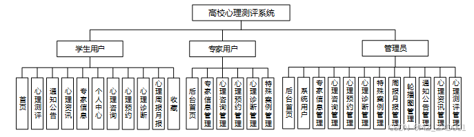 通过上一章节的功能需求分析,可以得出本高校心理测评系统的功能结构图,图3.1就是系统的功能模块图。