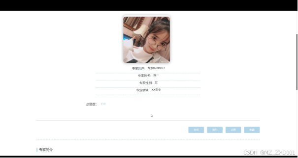 专家信息:查看心理专家的基本信息和擅长领域,包括专家名称、姓名、性别、专业领域、点赞数等信息,学生可以进行咨询、预约、点赞、收藏、评论等操作,以寻求专业指导和建议。界面如下图所示。