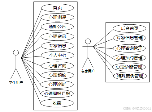 高校心理测评系统中学生用户角色功能包含了首页、心理测评、通知公告、心理资讯、专家信息、个人中心、心理咨询、心理预约、心理诊断、心理周报月报、收藏等功能,专家用户角色功能包含了专家信息管理、心理咨询管理、心理预约管理、心理诊断管理、特殊案例管理等功能模块,用户的用例图如图2.1所示:
