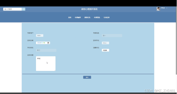 - 心理咨询:在专家信息界面可以进行在线心理咨询,与心理专家进行交流和倾诉。在后台的心理咨询模块可以查看提交的咨询信息和专家的答复。