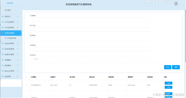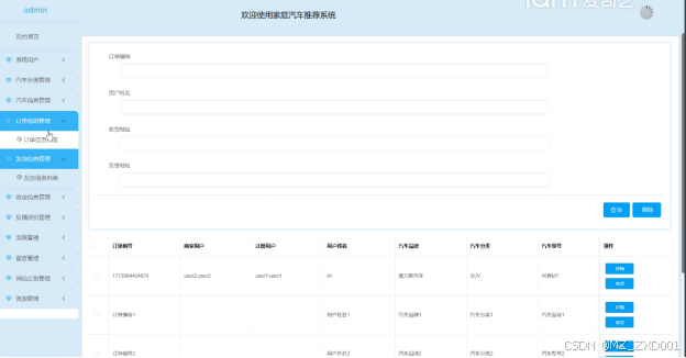 (4)订单信息管理:点击“订单信息管理”这个菜单,可以查看到订单信息详情,进行查询,添加、删除等操作。