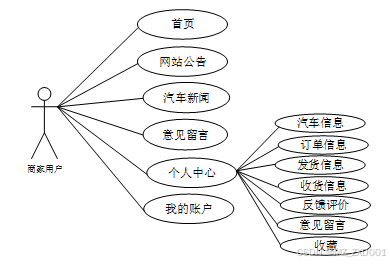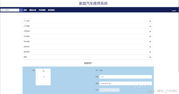 商家用户进入后台基于协同过滤的家庭汽车推荐系统的时候,可以看到首页、网站公告、汽车新闻、意见留言、我的账户、个人中心(个人首页、汽车信息、订单信息、发货信息、收货信息、反馈评价、意见留言、收藏)等功能。界面如下图4-8所示。