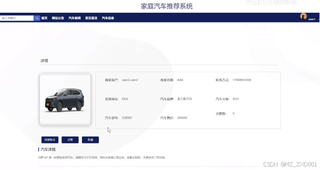 - 汽车信息:点击“汽车信息”这个菜单,可以查看到系统中所有添加的汽车信息,支持通过关键词进行查询,如果想要了解某一汽车信息的详细信息,点击后面的“详情”会进入详情查看界面,可以对汽车信息进行我要购买、收藏、评论等操作;