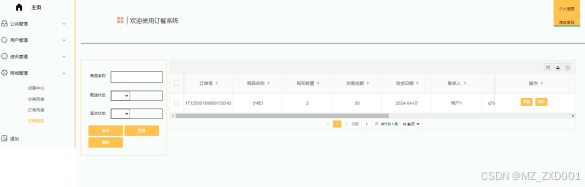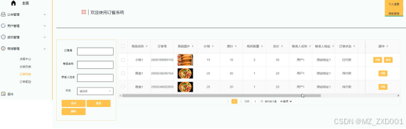订单列表:管理员查看订单的详细信息,包括订单号、价格、商品名称、原价、购买数量、总价、联系人名称、联系人地址、订单状态等,并进行查询、重置、删除等操作。界面如下图所示。