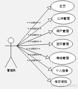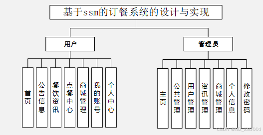 通过订餐系统,用户功能包括首页、公告信息、餐饮资讯、点餐中心、商城管理、我的账号、个人中心等。管理员功能包括主页、公共管理、用户管理、资讯管理、商城管理、个人信息等。根据系统功能需求建立的模块关系图如下图:
