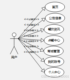 (1)用户功能包括首页、公告信息、餐饮资讯、点餐中心、商城管理、我的账号、个人中心。管理员功能包括主页、公共管理、用户管理、资讯管理、商城管理、个人信息。以上功能分析能够满足用户和管理员在订餐系统中的不同需求,实现便捷、安全和高效的购物体验和管理。