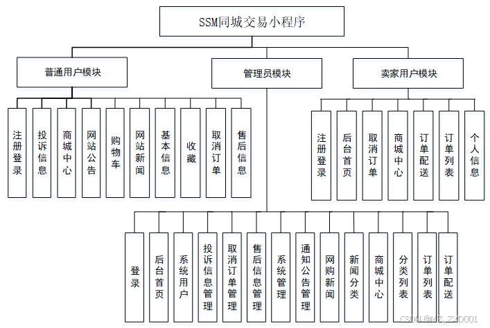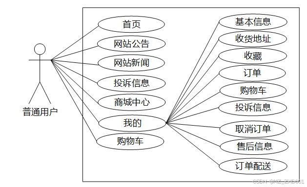 1.普通用户主要使用系统的同城交易小程序查看首页、投诉信息、商城中心、网站公告、网站新闻、购物车、我的(基本信息、收货地址、收藏、订单、购物车、投诉信息、取消订单、售后信息、订单配送)等,下图所示为普通用户的用例图。