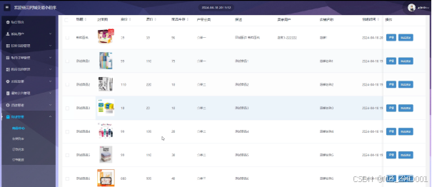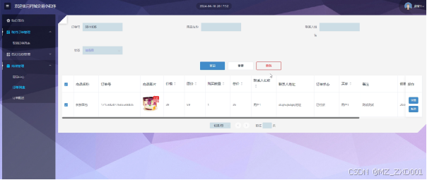 在商城管理页面中可以看到商品信息+订单列表+分类列表+订单配送这四个子菜单,管理员可根据需要对这四个子菜单进行增删书改查等操作,商城管理效果图如图5.6所示。