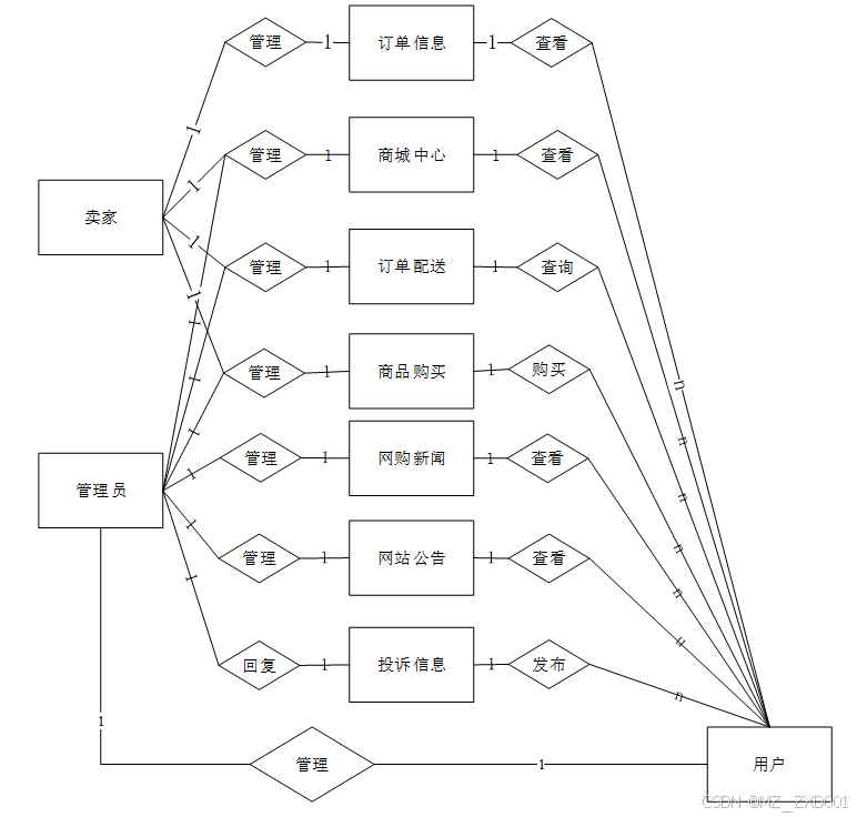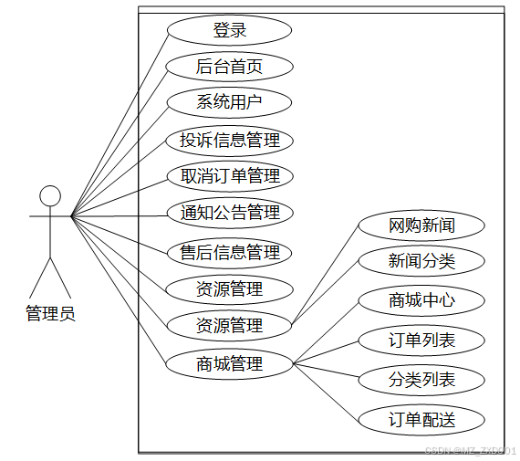 2.管理员主要负责后台首页、后台首页、系统用户、投诉信息管理、取消订单管理、售后信息管理、系统管理、通知公告管理、资源管理(网购新闻、新闻分类)、商城管理(商城中心、分类列表、订单列表、订单配送)、个人信息等功能模块,下图所示描述管理员的用例图。