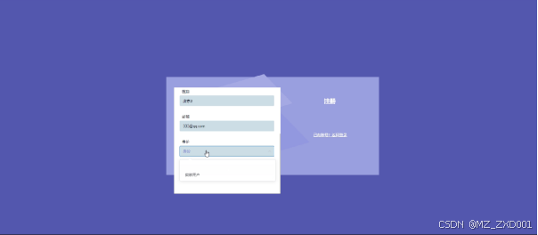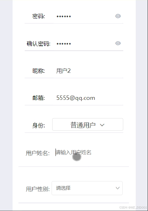 用户注册在登陆页面填写账号、密码、邮箱、昵称、身份、用户姓名、用户性别等信息,进行注册如图5.13所示