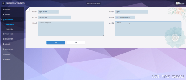 管理员在投诉信息列表页面可通过用户姓名或投诉时间进行快速搜索查看用户提交的投诉反馈信息并进行回复,可对用户提交的投诉信息进行详情、删除等操作,回复投诉信息如图5.4所示。