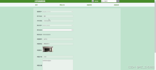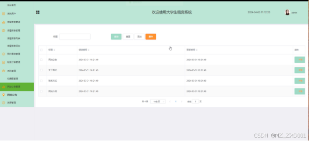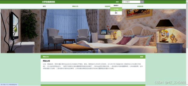 网站公告: 显示系统发布的重要通知和公告信息,包括租房政策、系统更新等。